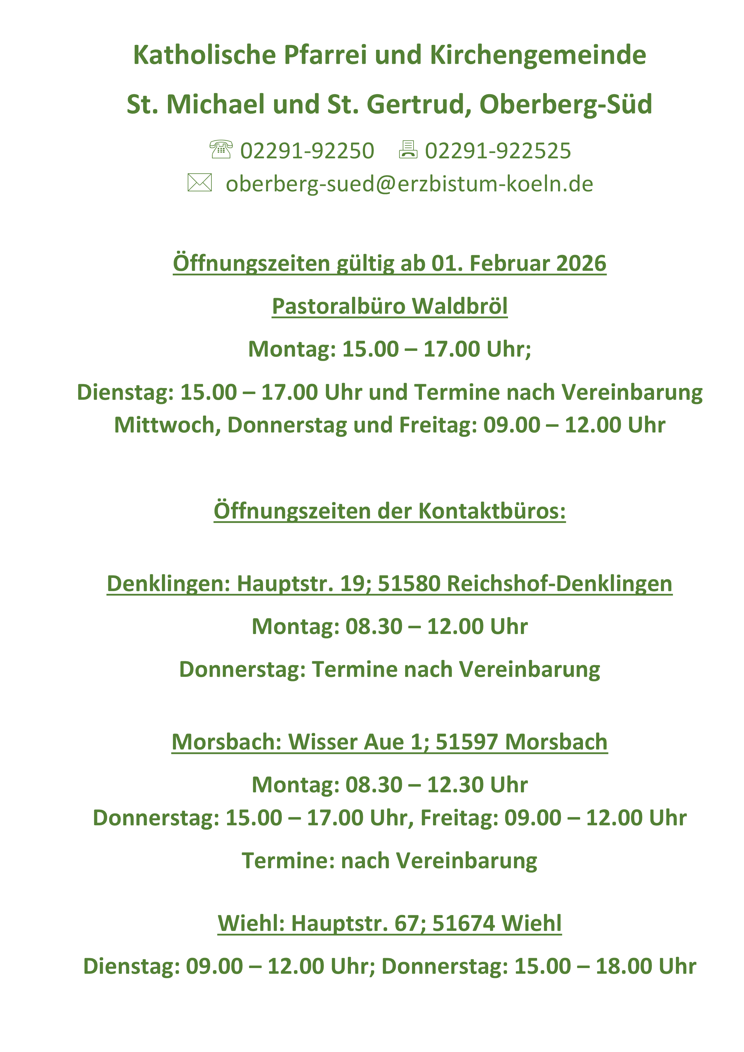 Geänderte Öffnungzeiten der katholischen Pfarrei und Kirchengemeinde St. Michael und St. Gertrud, Oberberg-Süd