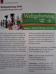 Die Frauengemeinschaft Lichtenberg lädt ein zum diesjährigen Weltgebetstag der Frauen am 6. März 2026.