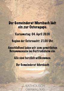 Der Gemeinderat Morsbach lädt ins Gertrudisheim ein zur Osteragape am Karsamstag nach der Osternacht.