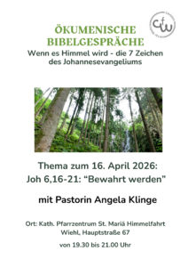 Herzliche Einladung zu den ökumenischen Bibelgesprächen der Christen in Wiehl am 16. April 2026 um 19:30 Uhr im katholischen Pfarrzentrum.