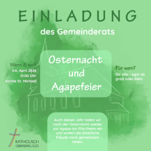 Auch dieses Jahr laden wir wieder nach der Osternacht zur Agape ins Pfarrheim ein und wollen die österliche Freude noch gemeinsam teilen.