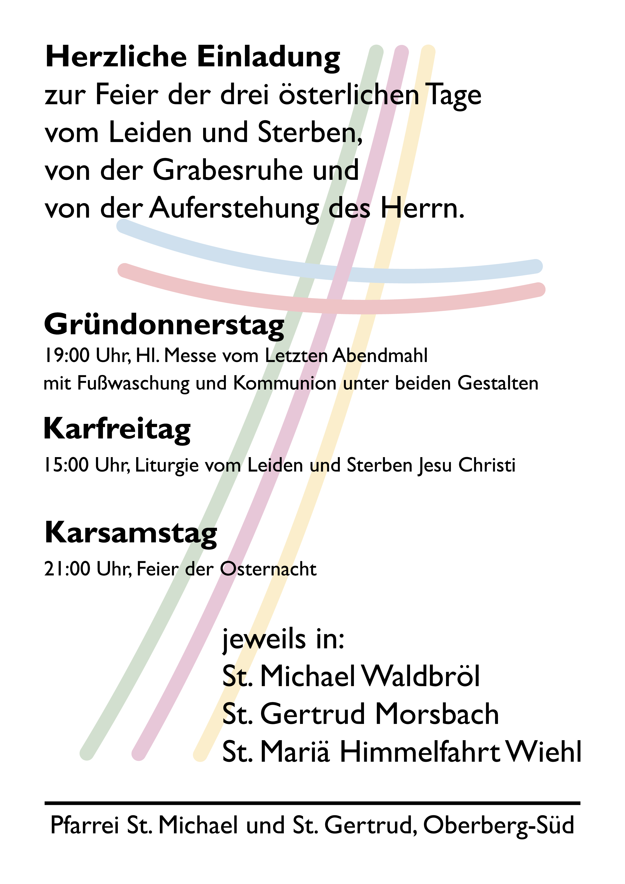 Gründonnerstag, Karfreitag und Karsamstag jeweils in St. Michael Waldbröl, St. Gertrud Morsbach und St. Mariä Himmelfahrt Wiehl. Alle Messen an Ostersonntag und Ostermontag entnehmen Sie bitte der Gottesdienstordnung.