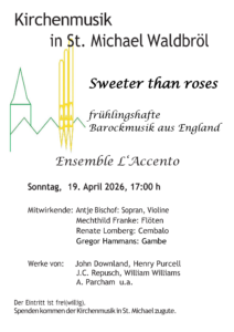 Am 19. April 2026 konzertiert das Ensemble L`Accento in der Kirche St. Michael Waldbröl. Mit Werken englischer Komponisten wie Dowland, Purcell, Hume, Pepusch …. wird das erwachende Leben in Gottes