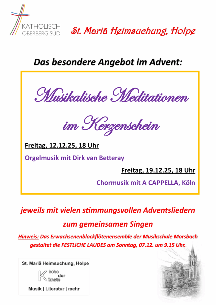 In St. Mariä Heimsuchung Holpe finden im Advent zwei stimmungsvolle musikalische Andachten im Kerzenschein statt. Am Freitag, 12. Dezember 2026 um 18 Uhr spielt Dirk van Betteray auf der historischen