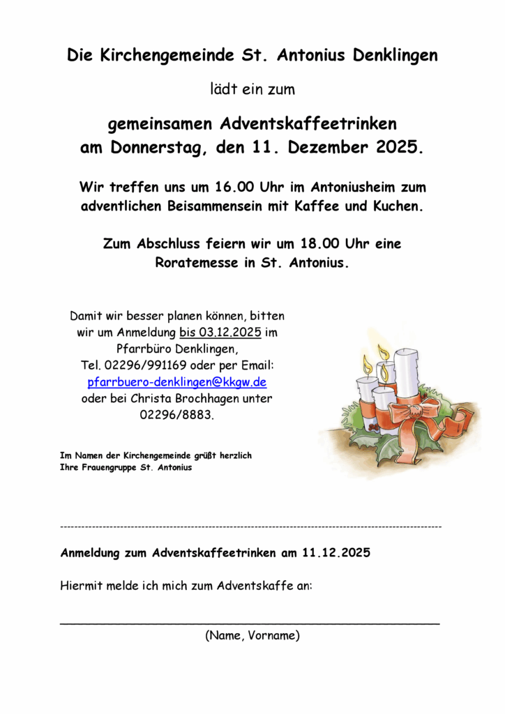 Die Kirchengemeinde St. Antonius Denklingen lädt ein zum gemeinsamen Adventskaffeetrinken am Donnerstag, 11.12.25, 16:00 Uhr. Zum Abschluss wird um 18:00 Uhr eine Roratemesse gefeiert.