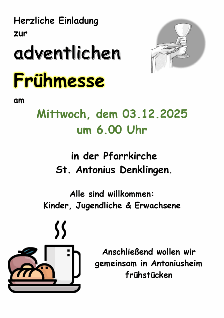 Herzliche Einladung an alle zur adventlichen Frühmesse am Mittwoch, 3.12.2025, 6:00 Uhr in St. Antonius Denklingen.