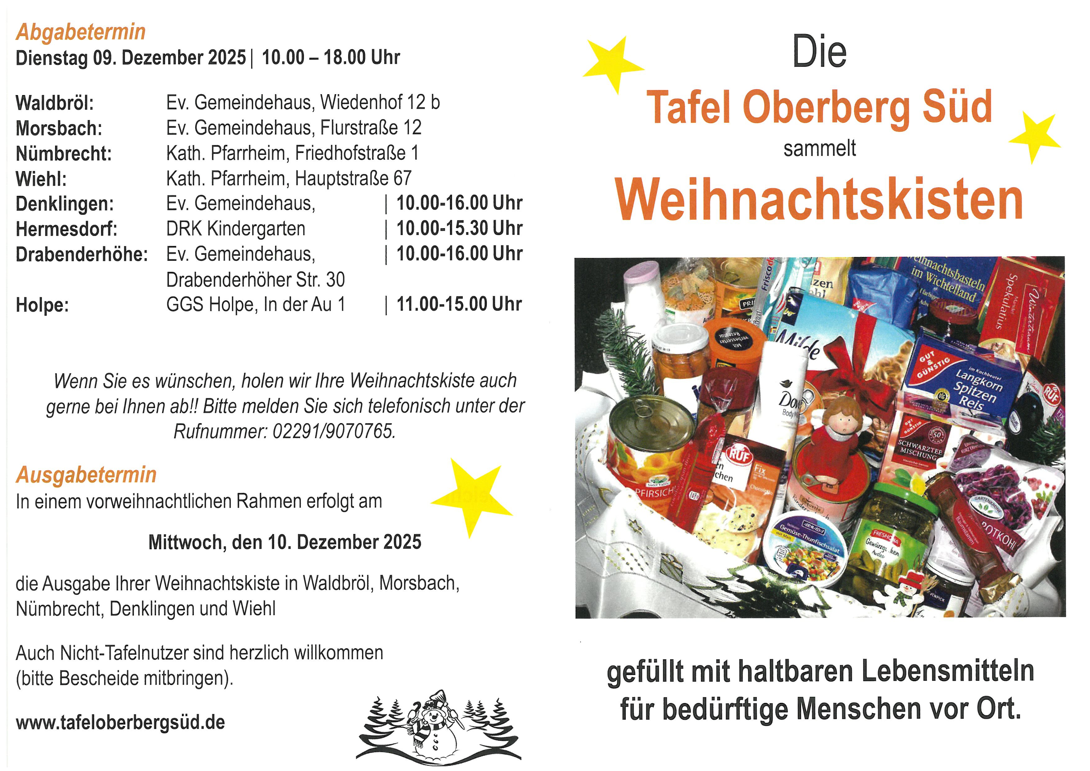 Die Tafel Oberberg Süd sammelt Weihnachtskisten. Abgabetermin ist der 9. Dezember 2025 zwischen 10:00 und 18:00 Uhr an den aufgeführten Stellen, die Ausgabe erfolgt am 10. Dezember 2025.
