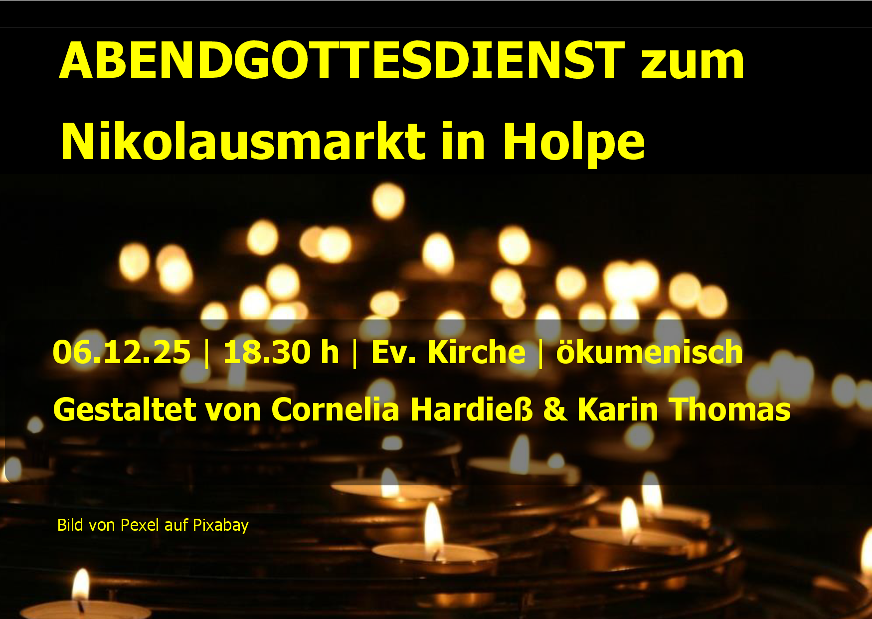 Am 6. Dezember 2025 findet um 18:30 Uhr in der evangelischen Kirche in Holpe der ökumenische Abendgottesdienst zum Nikolausmarkt statt. Gestaltung Cornelia Hardieß und Karin Thomas.