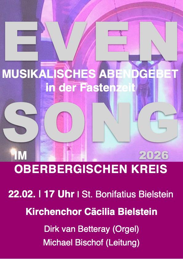Am 22. Februar 2026 findet um 17:00 Uhr in St. Bonifatius Bielstein der EVENSONG, ein musikalisches Abendgebet in der Fastenzeit, statt.