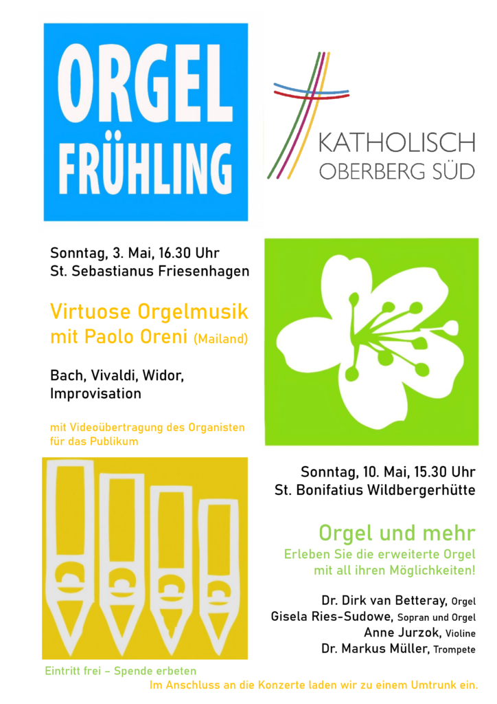 Zusätzlich zu den beiden bereits bestehenden Terminen am 03. Mai um 16.30 Uhr in St. Sebastianus Friesenhagen mit dem italienischen Orgelvirtuosen Paolo Oreni (Orgel solo) und am 10. Mai um 15.30 Uhr in St. Bonifatius in Wildbergerhütte mit Gisela Ries-Sudowe, Anne Jurzok, Dr. Markus Müller und Dr. Dirk van Betteray (Orgel im Dialog) erhält der Orgelfrühling weiteren Zuwachs: Am Dienstag, 12. Mai um 19.00 Uhr gibt es in Maria Königin in Friesenhagen-Steeg eine Maiandacht mit besonderer Orgelmusik mit Markus Brandt (Liturgie) und Dr. Dirk van Betteray an der Orgel (Orgel und Liturgie) auf der dortigen historischen Orgel. Das ist die letzte Möglichkeit, die Orgel an ihrem jetzigen Aufstellungsort zu erleben. Um das Instrument aufgrund des schlechten Raumklimas in Steeg zu retten, wird die Orgel in die „Kirche der Künste“ nach Morsbach-Holpe überführt, wo sie als Konzert- und Begleitinstrument dienen wird. So wird ein wichtiges historisches Instrument aus der Region für die Region erhalten und bekommt mit der bedeutenden historischen Klaisorgel, die ebenfalls in Holpe steht, gute Gesellschaft.