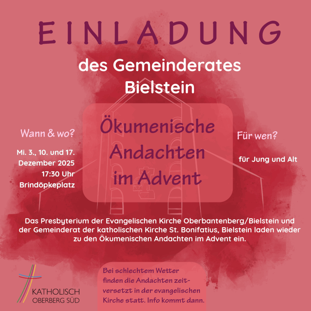 Das Presbyterium der Evangelischen Kirche Oberbantenberg/Bielstein und der Gemeinderat der katholischen Kirche St. Bonifatius, Bielstein laden wieder zu den Ökumenischen Andachten im Advent ein.