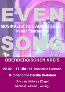 Am 22. Februar 2026 findet um 17:00 Uhr in St. Bonifatius Bielstein der EVENSONG, ein musikalisches Abendgebet in der Fastenzeit, statt.