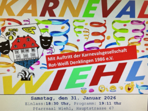 Herzliche Einladung zur Karneval Veranstaltung in Wiehl am Samstag 31. Januar 2026. Einlass ist ab 18:30 Uhr. Das Programm beginnt um 19:11 Uhr. Besonderes Highlight wird der Auftritt der Karnevalsgesellschaft