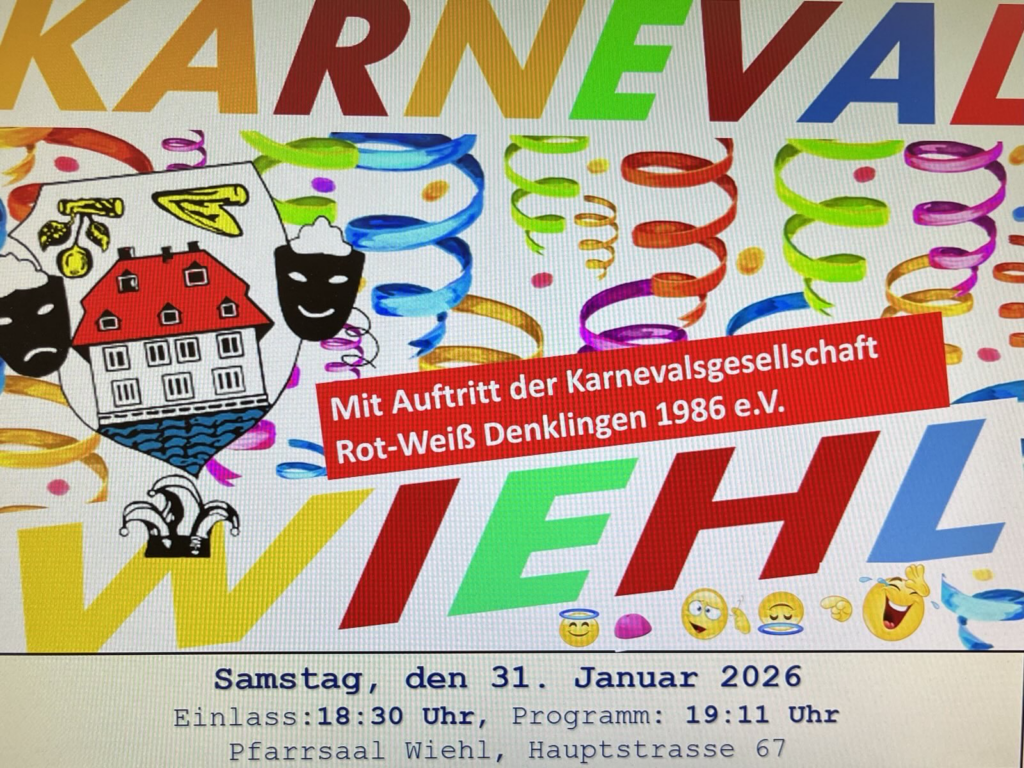Herzliche Einladung zur Karneval Veranstaltung in Wiehl am Samstag 31. Januar 2026. Einlass ist ab 18:30 Uhr. Das Programm beginnt um 19:11 Uhr.