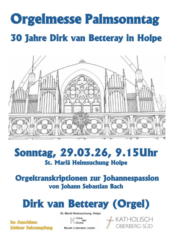 Am Palmsonntag, 29. März 2026 um 9.15 Uhr wird die Hl. Messe in St. Mariä Heimsuchung Holpe daher als Orgelmesse gestaltet. Im Anschluss findet ein kleiner Sektempfang statt, um gemeinsam ein wenig Rückschau auf diese 30 Jahre halten zu können. Dirk van Betteray spielt in der Orgelmesse vorwiegend Orgeltranskriptionen zu Werken aus der Johannespassion von Johann Sebastian Bach, die am Karfreitag, 03. April um 19 Uhr mit Solisten Chor und Orchester ebenfalls in der „Kirche der Künste“ in Holpe erklingen wird. Eine weitere Aufführung findet auch am Palmsonntag um 17 Uhr in St. Bonifatius Bielstein statt. Karten sind bereits jetzt im Vorverkauf im Musikschulbüro in Wiehl, im Pfarrbüro in Morsbach und bei den Chormitgliedern erhältlich.