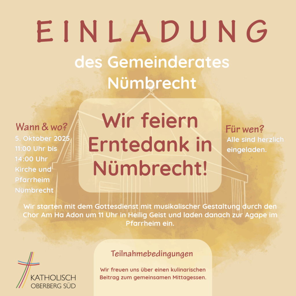 Der Gemeinderat Nümbrecht lädt zum Erntedank ein. Es beginnt um 11:00 Uhr mit der Messe und im Anschluss gibt es im Pfarrheim eine Agape.